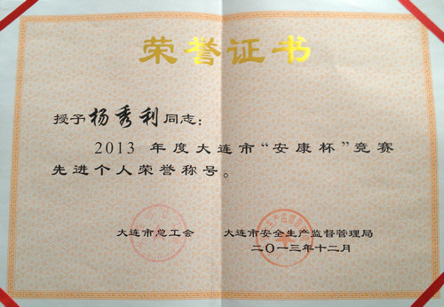工程公司大船重工二工場作業區楊秀利被授予大連市“安康杯”先進個人榮譽稱號